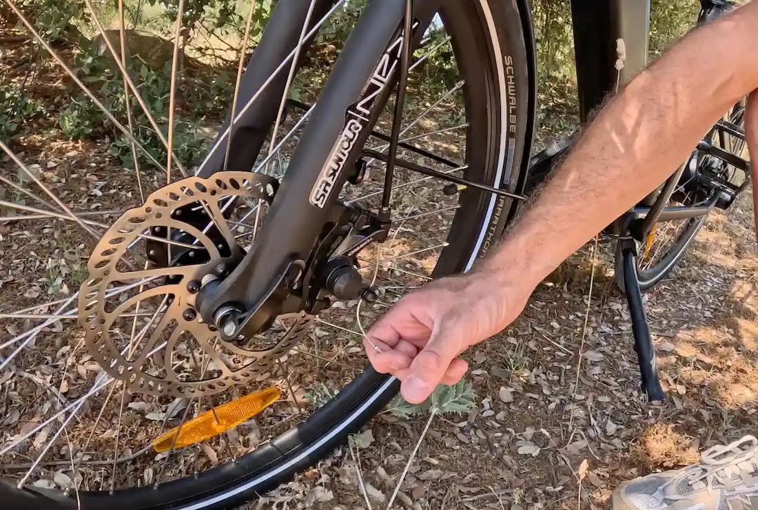 Les freins à disque sont des Tektro, un bon point car la marque a aujourd’hui une solide réputation dans le monde du vélo, même sur les modèles d’entrée de gamme. Par contre ce sont des freins mécaniques (moins bien que des hydrauliques) qui demandent un peu d’anticipation. Ils freinent correctement, mais manquent de progressivité, surtout par temps humide. Il faut appuyer fort pour avoir un bon ralentissement, ce qui peut surprendre si on vient d’un vélo mieux équipé (freins à disque hydraulique). Cela dit, pour un usage urbain tranquille, ça reste suffisant à condition de rester attentif.