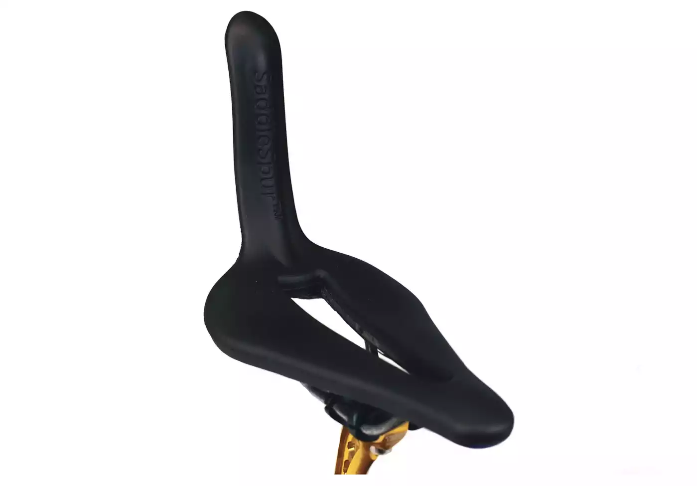 Cette selle de vélo innovante imaginée par SaddleSpur intègre un mini dossier qui réduit le recul sur la selle et augmente ainsi l’efficacité du pédalage. L’ouverture centrale permet de réduire la pression sur la zone du périnée.